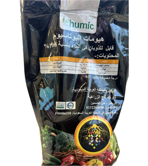 تركيبة تحتوي علي حمض الهيوميك الذي يعمل علي تحسين خواص التربة كما يحتوي علي حمض الفولفيك اللذان يساعدان في تخليب العناصر الغذائية في التربة في صورة سهلة يمتصها النبات وكذلك يحتوي علي عنصر البوتاسيوم الذي يحتاجه النبات خلال فترة النمو والاثمار